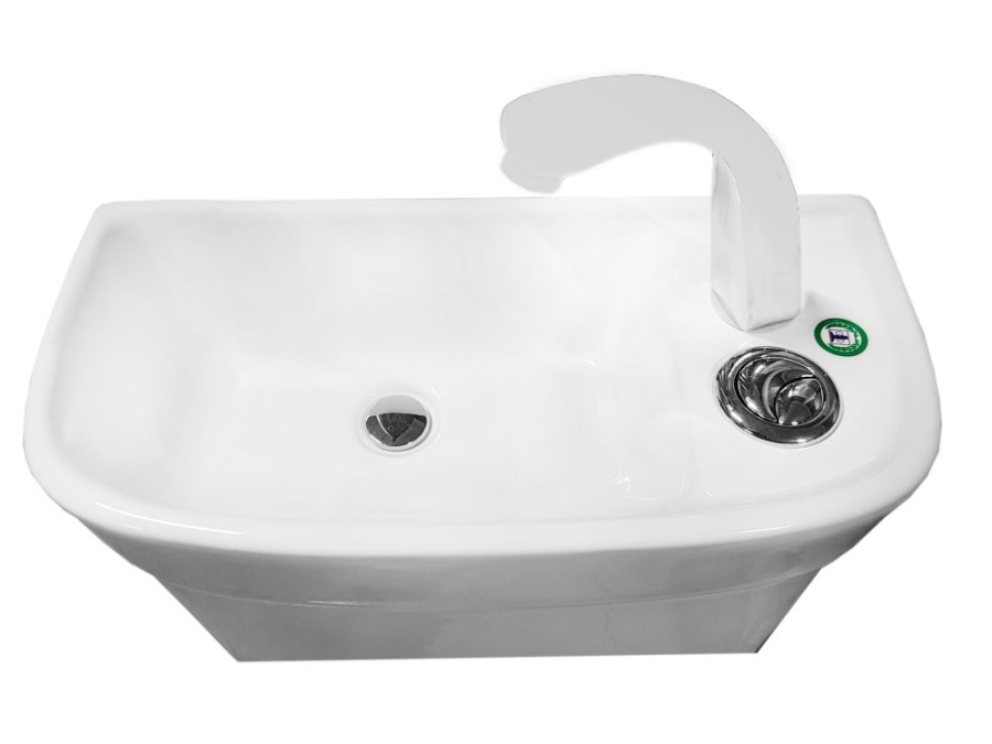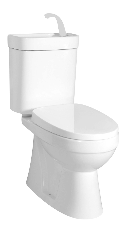Su lėtai nusileidžiančiu dangčiu, praustuvu ir baltos spalvos kraneliu šaltam vandeniui.